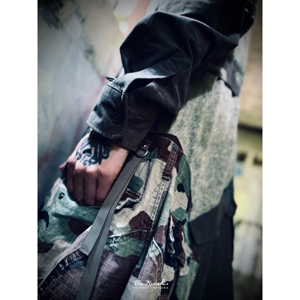 ビンテージのミリタリーシャツを解体して結合。シャツ上部のアシッドウォッシュカラーと下部のカモフラージュ柄のアシンメトリーパッチワークの組み合わせが特徴。